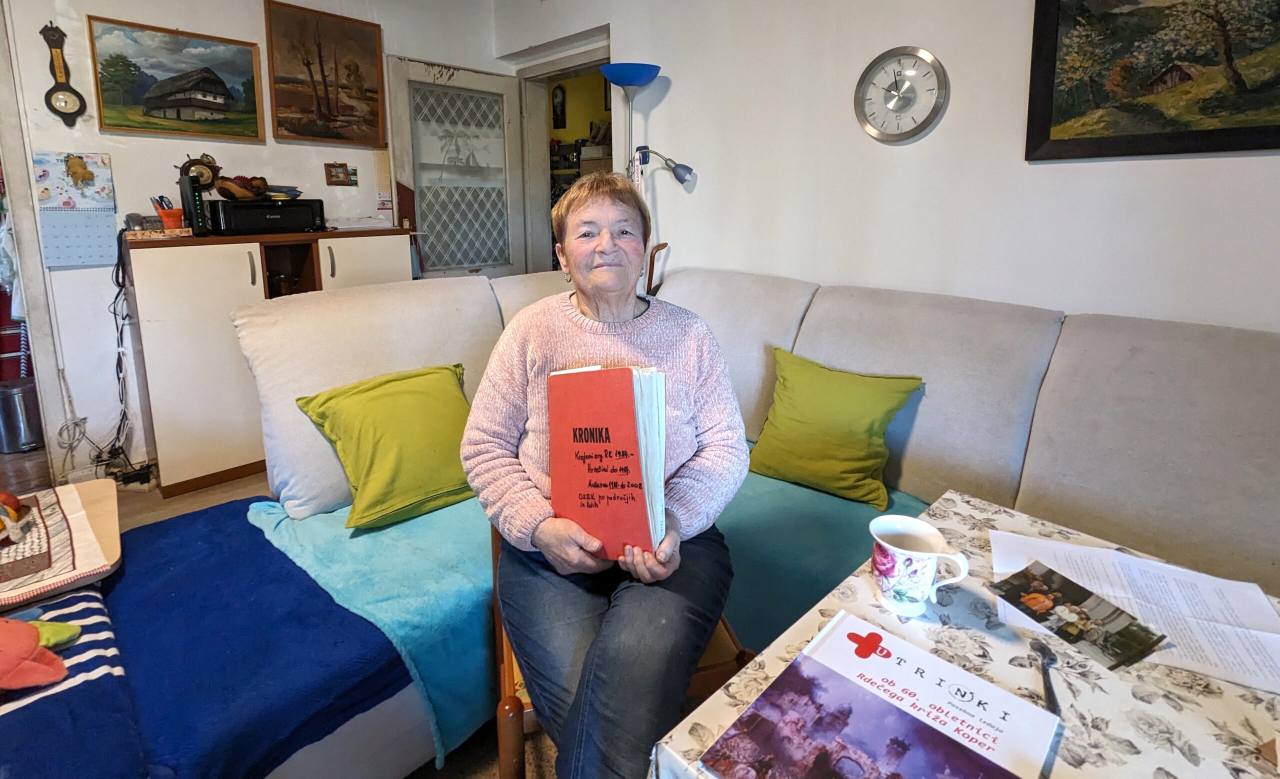 V velik rdeč zvezek je Marija Jereb dolga leta v besedi in sliki beležila aktivnosti hrvatinskega in ankaranskega krajevnega odbora Rdečega križa ter OZRK Koper. (Foto: Uredništvo)