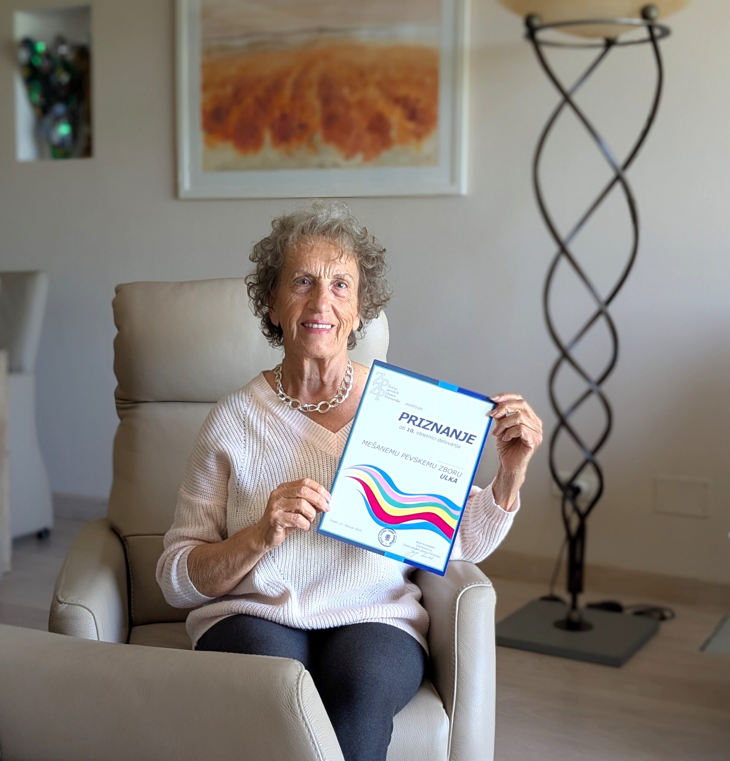 Nadja Štok je ponosna na priznanje, ki ga je ob 10. obletnici delovanja MePZ Ulka v februarju prejela od Zveze pevskih zborov Primorske. (Foto: Uredništvo)