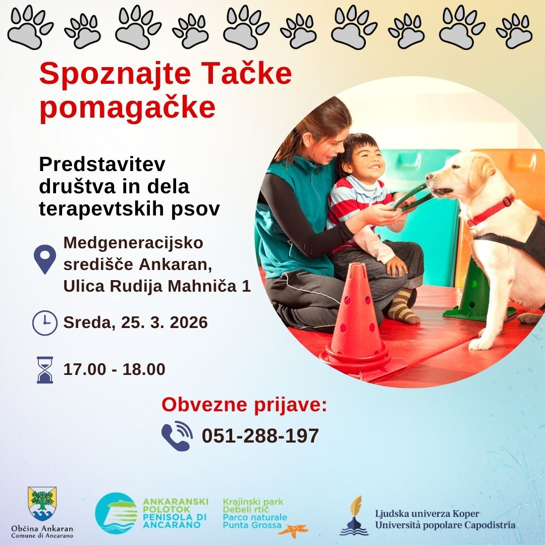 V sredo, 25. marca, ob 17. uri vljudno vabljeni na predstavitev društva Tačke pomagačke in dela terapevtskih psov, ki jo pripravljamo v sodelovanju z Ljudsko univerzo Koper.