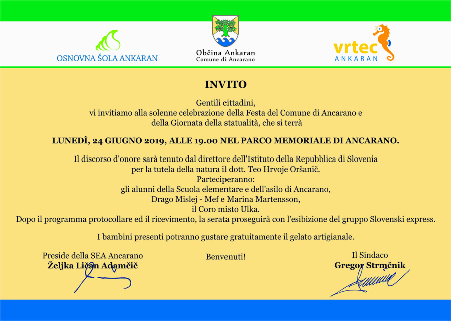 Vi invitiamo alla solenne celebrazione della Festa del Comune di Ancarano e della Giornata della statualita`, che si terra` lunedi`, 24 giugno 2019, alle 19.00 nel Parco memoriale di Ancarano.