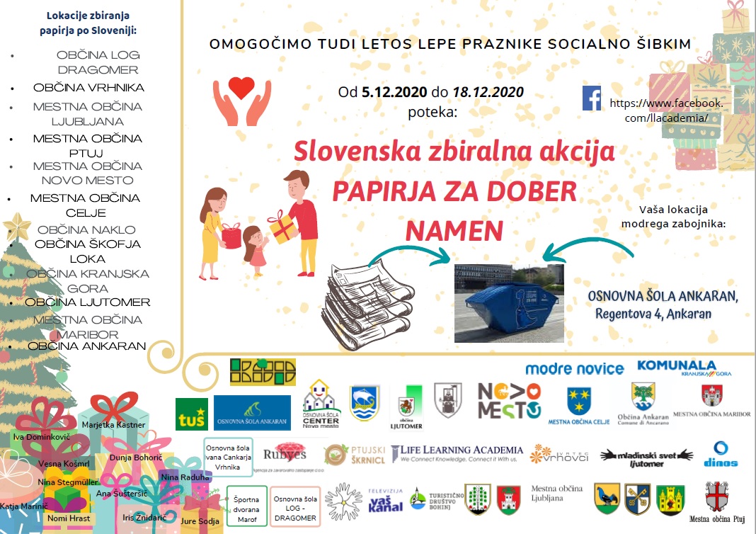 È un progetto destinato ad aiutare le famiglie socialmente vulnerabili, alle quali la raccolta slovena di cartastraccia per una buona causa fornirà i fondi per un futuro migliore. Siete gentilmente invitati a partecipare. Potete consegnare la cartastraccia nel contenitore apposito, che si trova sul piazzale della Scuola elementare di Ancarano, dal 5 al 18 dicembre 2020.