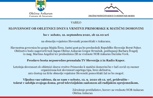La cerimonia di commemorazione dell’anniversario della giornata di ritorno del Litorale alla madre patria di quest’anno sarà diversa rispetto agli anni precedenti. Alla luce dell’emergenza Covid-19, la cerimonia si svolgerà a porte chiuse, senza la presenza del pubblico. Il programma dell’evento prevede un connubio di esibizioni sul palcoscenico, di immagini di esibizioni registrate in diversi luoghi del comune ancaranese e di registrazioni d’archivio dei diversi momenti storici del Litorale e della sua gente.