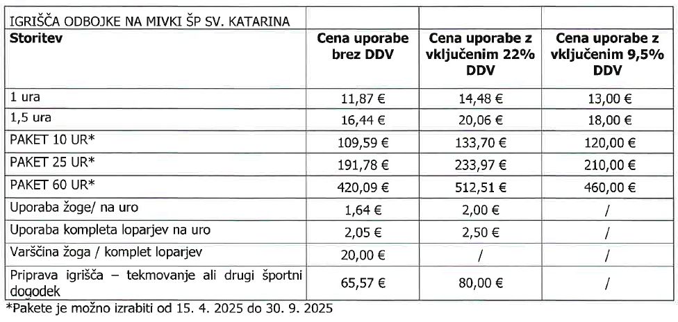 Uporabnina se poravna ob rezervaciji termina oziroma skladno z določili pogodbe o rezervaciji igrišč. V ceno uporabe je vključena uporaba igrišča, garderobe, zunanjega tuša in skupnih sanitarij.