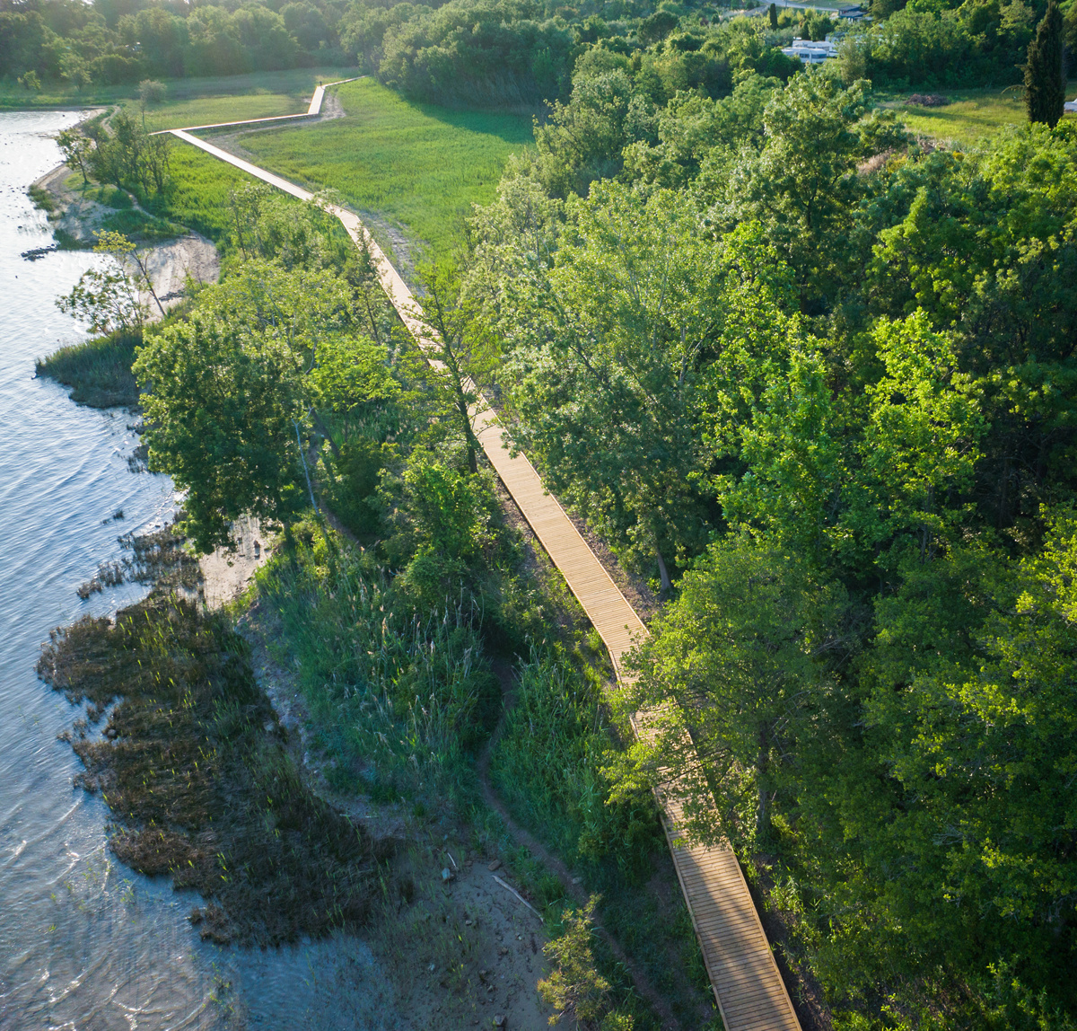 - Uporaba naravnih materialov pri urejanju prostora in obale (lesene in/ali dvignjene brvi, zeleno urejanje, omejevanje posegov v naravne habitate).