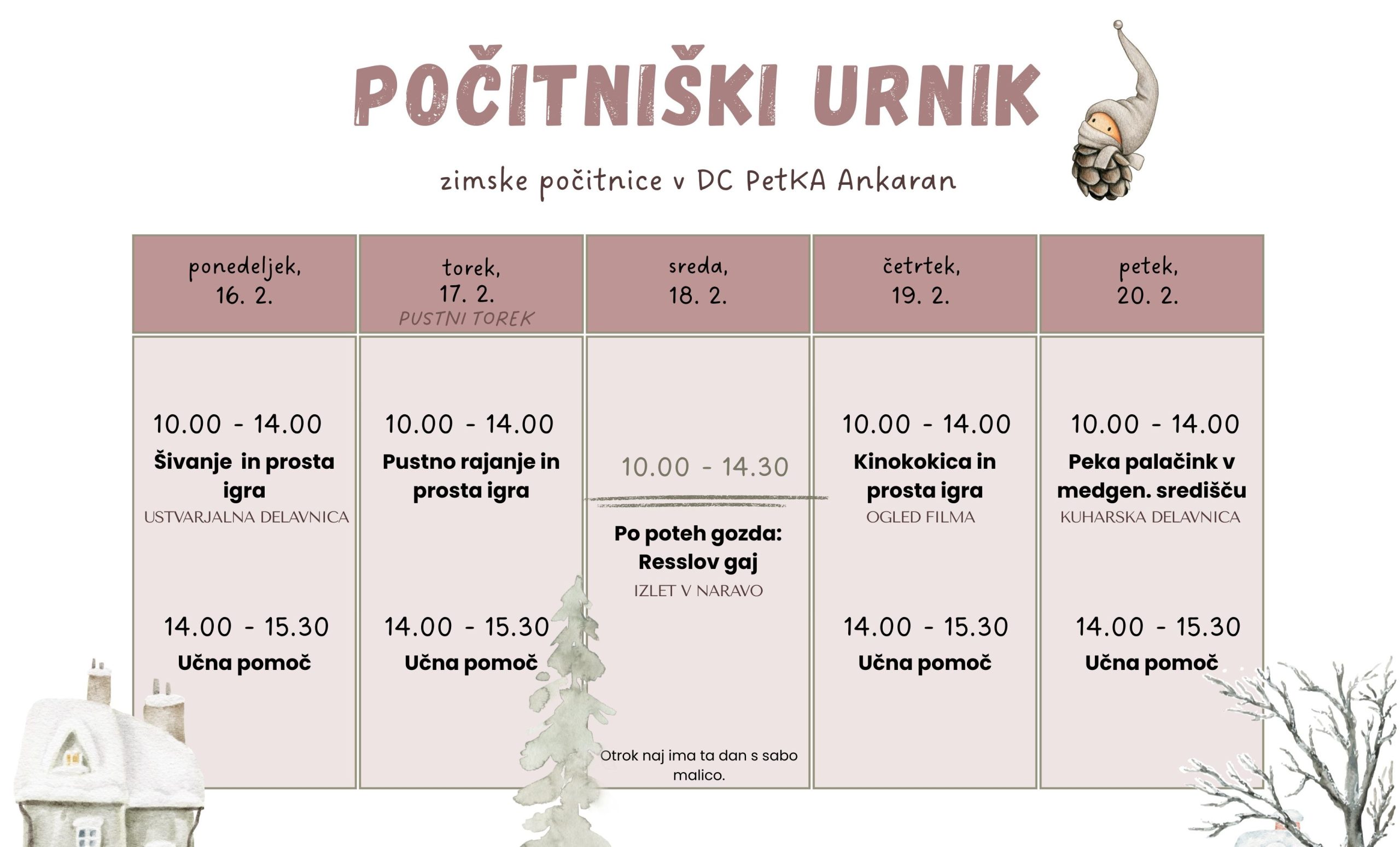 Starše vabijo k vključitvi otrok v program, kjer bodo skozi ustvarjalne, športne in sprostitvene aktivnosti skupaj preživljali prosti čas. V torek, 17. februarja, bodo sprostitvene in ustvarjalne aktivnosti v znamenju pustnega rajanja.