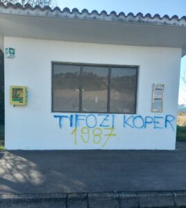Avtobusno postajališče na območju Sončnega parka je očitno priljubljena točka objestnežev. Lani poleti so se spravili nad tamkajšnji defibrilator, v nedeljo pa so stavbo na postaji popackali z napisom. V navijaški skupini Tifozi Koper 1987 so se hitro odzvali.