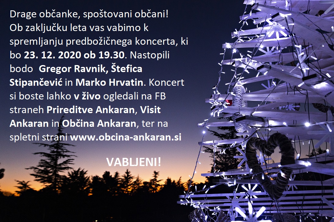 Ob zaključku leta vljudno vabljeni k spremljanju predbožičnega koncerta, ki bo 23. 12. 2020 ob 19.30. Ogled bo možen prek FB strani Prireditve Ankaran, Visit Ankaran in Občina Ankaran ter na spletni strani Občine Ankaran.